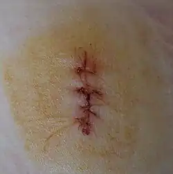 The end goal of wound care is to re-establish the integrity of the skin, a structure which serves as a barrier to the external environment.[33] The preferred method of closure is to reattach/reapproximate the wound edges together, a process known as primary closure/healing by primary intention. Wounds that have not been closed within several hours of the initial injury or wounds that are concerning for infection will often be left open and treated with dressings for several days before being closed 3–5 days later, a process known as delayed primary closure. The exact duration of time from initial injury in which delayed primary closure is preferred over primary closure is not clearly defined.[34] Wounds that cannot be closed primarily due to substantial tissue loss can be healed by secondary intention, a process in which the wound is allowed to fill-in over time through natural physiologic processes. When healing by secondary intention, granulation tissue grows in from the wound edges slowly over time to restore integrity of the skin. Healing by secondary intention can take up to months, requires daily wound care, and leaves an unfavorable scar, thus primary closure is always preferred when possible.[27][35] As an alternative, wounds that cannot be closed primarily can be addressed with skin grafting or flap reconstruction, typically done by a plastic surgeon.[33] There are several methods that can be implemented to achieve primary closure of a wound, including suture, staples, skin adhesive, and surgical strips. Suture is the most frequently used for closure.[27] There are many types of suture, but broadly they can be categorized as absorbable vs non-absorbable and synthetic vs natural. Absorbable sutures have the added benefit of not requiring removal and are often preferred in children for this reason.[36] Staples are less time-consuming and more cost effective than suture but have a risk of worse scarring if left in place for too long.[27] Adhesive glue and sutures have comparable cosmetic outcomes for minor lacerations <5 cm in adults and children.[37] The use of adhesive glue involves considerably less time for the doctor and less pain for the person. The wound opens at a slightly higher rate but there is less redness.[38] The risk for infections (1.1%) is the same for both. Adhesive glue should not be used in areas of high tension or repetitive movements, such as joints or the posterior trunk.[37]