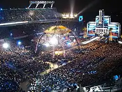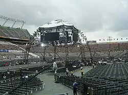 With the Citrus Bowl's locker rooms on the south side and the entrance set on the north side, a tented 40,000 square feet (3,700 m2) mini-city outside the north end served as the show's backstage area and included air conditioning, trailers, VIP areas, showers and restrooms.[16] As a consequence, the road next to the north end zone, W. Church Street, was closed down until a day after the event.[21] Numerous other roads were also closed to allow trucks and forklifts to move in mega equipment for the event.[22] The ring itself was built on the 50-yard line of the Citrus Bowl to give the best view for fans.[15] Heavy-duty plastic flooring had been put over the field, to protect the turf, provide seating, and serve as the steel structures' foundation.[16]