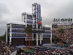 The set design for the entrance stage was at the north end of the stadium and consisted of another steel structure with various video screens hanging from it.[16][18] The steel beams for the structure were custom built in Belgium and shipped over to Orlando.[16] According to WWE Magazine, the amount of pyrotechnics used would be ten times that of the amount used on Raw.[15] Without the restriction of a roof, the pyrotechnics for the show shot as high as 2,000 feet (610 m) as compared to WrestleMania 23's height of 150 feet (46 m).[19] The fireworks were set off from boats on one of the lakes nearby the stadium. WWE has been said to have spent an estimated $300,000 on the fireworks alone.[20]