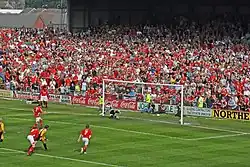 During the 2011–12 season, Wrexham were invited back into the Welsh Cup after 16 years, entering at the third round stage.[67] New manager Andy Morrell guided Wrexham to a record tally of 98 points but this was not enough to gain automatic promotion, as they ended the season only 5 points adrift of Fleetwood Town, who gained the only automatic place.[68] Wrexham lost in the play-offs to Luton Town again.[69] Wrexham earned themselves places in both the FA Trophy final and the Conference Premier play-off final, their first two appearances at Wembley Stadium in the club's 150-year history to date, and within five weeks of one another. In the FA Trophy final, Wrexham won on penalties after a 1–1 draw with Grimsby Town.[70] A 5–2 aggregate win over Kidderminster Harriers in the two-legged play-off semi-final saw Wrexham through to the final versus Newport County, the first play-off final to feature two Welsh teams; Newport defeated Wrexham 2–0.[71]