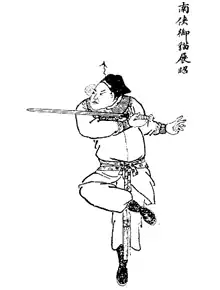 - Qinggong: A form of real Chinese martial arts.[27] In wuxia fiction, however, its use is exaggerated to the point that characters can circumvent gravity to fly, cover tremendous distances in a single stride, run across surfaces of water, mount trees, and jump over or scale high walls.