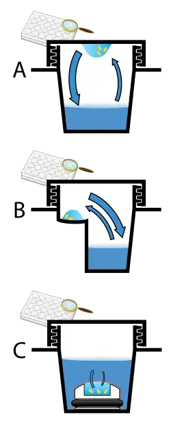 Three methods of preparing crystals, A: Hanging drop. B: Sitting drop. C: Microdialysis