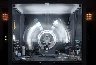 Crystal structures of proteins (which are irregular and hundreds of times larger than cholesterol) began to be solved in the late 1950s, beginning with the structure of sperm whale myoglobin by Sir John Cowdery Kendrew,[88] for which he shared the Nobel Prize in Chemistry with Max Perutz in 1962.[89] Since that success, 190,000 X-ray crystal structures of proteins, nucleic acids and other biological molecules have been determined.[90] The nearest competing method in number of structures analyzed is nuclear magnetic resonance (NMR) spectroscopy, which has resolved less than one tenth as many.[91] Crystallography can solve structures of arbitrarily large molecules, whereas solution-state NMR is restricted to relatively small ones (less than 70 kDa). X-ray crystallography is used routinely to determine how a pharmaceutical drug interacts with its protein target and what changes might improve it.[92] However, intrinsic membrane proteins remain challenging to crystallize because they require detergents or other denaturants to solubilize them in isolation, and such detergents often interfere with crystallization. Membrane proteins are a large component of the genome, and include many proteins of great physiological importance, such as ion channels and receptors.[93][94] Helium cryogenics are used to prevent radiation damage in protein crystals.[95]