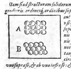 Drawing of square (A) and hexagonal (B) packing from Kepler's work, Strena seu de Nive Sexangula.