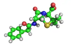 The three-dimensional structure of penicillin, solved by Dorothy Crowfoot Hodgkin in 1945. The green, red, yellow and blue spheres represent atoms of carbon, oxygen, sulfur and nitrogen, respectively. The white spheres represent hydrogen, which were determined mathematically rather than by the X-ray analysis.