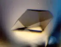 A protein crystal seen under a microscope. Crystals used in X-ray crystallography may be smaller than a millimeter across.