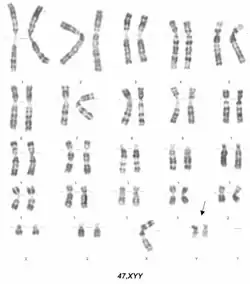 XYY syndrome, also known as Jacobs syndrome and Superman syndrome, is an aneuploid genetic condition in which a male has an extra Y chromosome.[1] There are usually few symptoms.[2] These may include being taller than average and an increased risk of learning disabilities.[1][2] Most individuals with this condition have normal fertility.[1]
