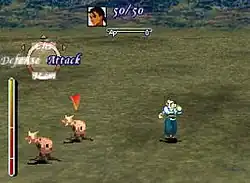 Xenogears combines traditional role-playing video game structures such as Square's signature Active Time Battle system with new features particular to the game's martial arts combat style. It features two slightly different battle systems: in the first, the player controls human characters in turn-based combat manipulated through the sequencing of learned combos. The second, making use of "gears", introduces different sets of statistics and abilities for each character.[2] Xenogears features both traditional anime and pre-rendered CGI movie clips by Production I.G to illustrate important plot points.[3] The player advances the protagonist and his companions through a three-dimensional fictional world.[4]