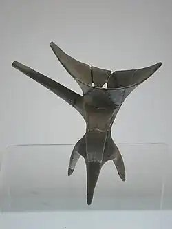 The only musical instruments found at Erlitou are a qing sounding stone, two small clapper bells (one earthenware, one bronze) and a xun with one finger hole.[51][52] Due to this extreme scarcity of surviving instruments and the general uncertainty surrounding most of the Xia, creating a musical narrative of the period is impractical.[53]