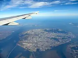 Aerial view of Xiamen Island, looking south. The Gaoji Causeway lies at the bottom and the old Yundang Harbor—now an inclosed lake—lies to the right. The Kinmen Islands, Republic of China (Taiwan) can be seen in the upper half of the photograph.