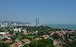 Xiamen is a sub-provincial city in southeastern Fujian whose urban core grew up from the port of Xiamen on southern Xiamen Island, now located within Siming District. It now also includes Gulangyu Island and the rugged coast of the mainland from the northeast bank of the Jiulong River in the west to the islands of Xiang'an in the east. Xiamen Island lies about one degree north of the Tropic of Cancer.[13] It is divided between Huli District in the north and Siming District in the south. Siming also includes Gulangyu. Its mainland territory is divided among Haicang, Jimei, Tong'an, and Xiang'an districts.