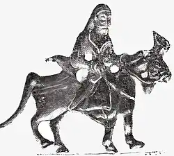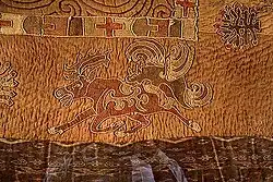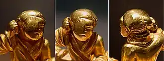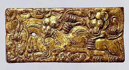 A nomad horseman spearing a boar, discovered in Saksanokhur, South Tajikistan, 1st–2nd century AD.[50][51] According to Francfort, this decorative belt buckle may have been made for a patron related to the Xiongnu, and may be dated to the 2nd-1st century BC. The rider wears the steppe dress, his hair is tied into a hairbun characteristic of the oriental steppes, and his horse has characteristically Xiongnu horse trappings.[52]
