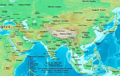 Xiongnu in their expansion drove their western neighbour Yuezhi from the Hexi Corridor in year 176 BC, killing the Yuezhi king and asserting their presence in the Western Regions.[13]