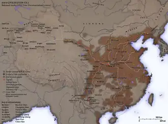 Western Han historian Sima Qian composed an early yet detailed exposition on the Xiongnu in one liezhuan (arrayed account) of his Records of the Grand Historian (c. 100 BC), wherein the Xiongnu were alleged to be descendants of a certain Chunwei, who in turn descended from the "lineage of Lord Xia", a.k.a. Yu the Great.[53][54] Even so, Sima Qian also drew a distinct line between the settled Huaxia people (Han) to the pastoral nomads (Xiongnu), characterizing them as two polar groups in the sense of a civilization versus an uncivilized society: the Hua–Yi distinction.[55] Sima Qian also mentioned Xiongnu's early appearance north of Wild Goose Gate and Dai commanderies before 265 BC, just before the Zhao-Xiongnu War;[56][57] however, sinologist Edwin Pulleyblank (1994) contends that pre-241-BC references to the Xiongnu are anachronistic substitutions for the Hu people instead.[58][59] Sometimes the Xiongnu were distinguished from other nomadic peoples; namely, the Hu people;[60] yet on other occasions, Chinese sources often just classified the Xiongnu as a Hu people, which was a blanket term for nomadic people.[58][61] Even Sima Qian was inconsistent: in the chapter "Hereditary House of Zhao", he considered the Donghu to be the Hu proper,[62][63] yet elsewhere he considered Xiongnu to be also Hu.[64][58]