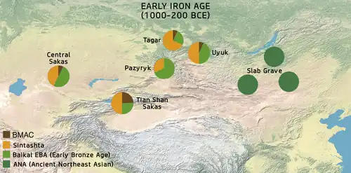 268. ^ Damgaard et al. 2018, pp. 371–374: "Principal Component Analyses and D-statistics suggest that the Xiongnu individuals belong to two distinct groups, one being of East Asian origin and the other presenting considerable admixture levels with West Eurasian sources... We find that Central Sakas are accepted as a source for these 'western-admixed' Xiongnu in a single-wave model. In line with this finding, no East Asian gene flow is detected compared to Central Sakas as these form a clade with respect to the East Asian Xiongnu in a D-statistic, and furthermore, cluster closely together in the PCA (Figure 2)... Overall, our data show that the Xiongnu confederation was genetically heterogeneous, and that the Huns emerged following minor male-driven East Asian gene flow into the preceding Sakas that they invaded... As such our results support the contention that the disappearance of the Inner Asian Scythians and Sakas around two thousand years ago was a cultural transition that coincided with the westward migration of the Xiongnu. This Xiongnu invasion also led to the displacement of isolated remnant groups—related to Late Bronze Age pastoralists—that had remained on the south-eastern side of the Tian Shan mountains."