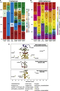 251. ^ Lee, Joo-Yup; Kuang, Shuntu (2017). "A Comparative Analysis of Chinese Historical Sources and Y-DNA Studies with Regard to the Early and Medieval Turkic Peoples". Inner Asia. 19 (2): 197–239. doi:10.1163/22105018-12340089. ISSN 1464-8172. S2CID 165623743. "Analysis of the mitochondrial DNA, which is maternally inherited, shows that the Xiongnu remains from this Egyin Gol necropolis consist mainly of Asian lineages (89%). West Eurasian lineages makeup the rest (11%) (Keyser-Tracqui et al. (2003: 258). However, according to a more recent study of ancient human remains from central Mongolia, the Xiongnu population in cen- tral Mongolia possessed a higher frequency of western mitochondrial DNA haplotypes (37.5%) than the Xiongnu from the Egyin Gol necropolis (Rogers 2016: 78)."