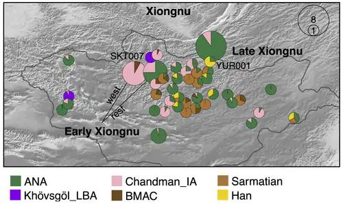 255. ^ Rogers & Kaestle 2022:"While during the slab burial period (ca.1100–300 BCE) eastern patrilines seem to have been dominant, in the Xiongnu period about half of the population had western patrilines with virtually no change to the mtDNA gene pool in east–west terms. If sex bias migration patterns were similar with those found in Europe, this increase of western patrilines would be consistent with aggressive expansion of people with western male ancestry (Batini et al., 2017); however, such a pattern could also be due to a gradual nonaggressive assimilation, such as the practice of marriage alliances associated with an expansion of trade or cultural networks that favored people with western patrilines (Honeychurch, 2013)."