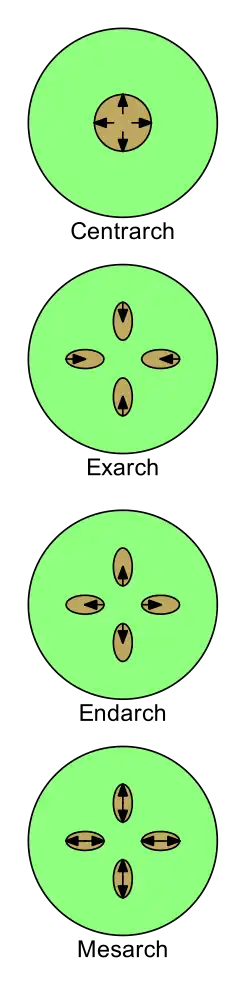 - Exarch is used when there is more than one strand of primary xylem in a stem or root, and the xylem develops from the outside inwards towards the center, i.e., centripetally. The metaxylem is thus closest to the center of the stem or root, and the protoxylem is closest to the periphery. The roots of vascular plants are generally considered to have exarch development.[46]