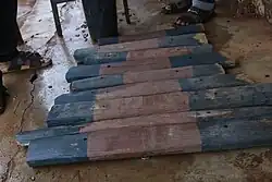 The akadinda and the amadinda are xylophone-like instruments originating in Buganda, in modern-day Uganda.[18] The amadinda is made of twelve logs which are tuned in a pentatonic scale. It mainly is played by three players. Two players sit opposite of each other and play the same logs in an interlocking technique in a fast tempo. It has no gourd resonators or buzzing tone, two characteristics of many other African xylophones.[19]