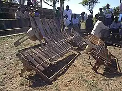 The mbila (plural "timbila") is associated with the Chopi people of the Inhambane Province, in southern Mozambique.[10] It is not to be confused with the mbira. The style of music played on it is believed to be the most sophisticated method of composition yet found among preliterate peoples.[12] The gourd-resonated, equal-ratio heptatonic-tuned mbila of Mozambique is typically played in large ensembles in a choreographed dance, perhaps depicting a historical drama. Ensembles consist of around ten xylophones of three or four sizes. A full orchestra would have two bass instruments called gulu with three or four wooden keys played standing up using heavy mallets with solid rubber heads, three tenor dibinda, with ten keys and played seated, and the mbila itself, which has up to nineteen keys of which up to eight may be played simultaneously. The gulu uses gourds and the mbila and dibinda Masala apple shells as resonators. They accompany the dance with long compositions called ngomi or mgodo and consist of about 10 pieces of music grouped into 4 separate movements, with an overture, in different tempos and styles. The ensemble leader serves as poet, composer, conductor and performer, creating a text, improvising a melody partially based on the features of the Chopi tone language and composing a second contrapuntal line. The musicians of the ensemble partially improvise their parts. The composer then consults with the choreographer of the ceremony and adjustments are made.[7] The longest and most important of these is the "Mzeno" which will include a song telling of an issue of local importance or even making fun of a prominent figure in the community![10] Performers include Eduardo Durão and Venancio Mbande.[10][13][14]