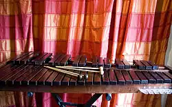 The term marimba is also applied to various traditional folk instruments such as the West Africa balafon. Early forms were constructed of bars atop a gourd.[9] The wood is first roasted around a fire before shaping the key to achieve the desired tone. The resonator is tuned to the key through careful choice of size of resonator, adjustment of the diameter of the mouth of the resonator using wasp wax and adjustment of the height of the key above the resonator. A skilled maker can produce startling amplification. The mallets used to play dibinda and mbila have heads made from natural rubber taken from a wild creeping plant.[10] "Interlocking" or alternating rhythm features in Eastern African xylophone music such as that of the Makonde dimbila, the Yao mangolongondo or the Shirima mangwilo in which the opachera, the initial caller, is responded to by another player, the wakulela.[11] This usually doubles an already rapid rhythmic pulse that may also co-exist with a counter-rhythm.