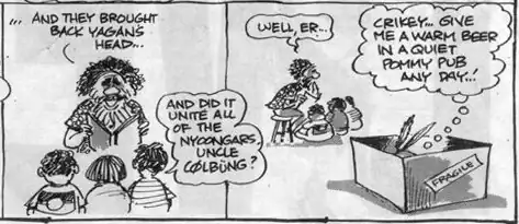 Meanwhile, divisions in the Noongar community in Perth began to develop. Some elders questioned Colbung's role and one Noongar registered a complaint with the Liverpool City Council over his involvement. Media reports indicated acrimonious debate within the Noongar community about who had the best cultural qualifications to take possession of the head.[62] The academic Hannah McGlade claims that these divisions were largely manufactured by the media, particularly The West Australian, which "aimed to and successfully represented the Nyungar community in terms of disharmony and dissent". She alleges that one West reporter contacted Noongar who were known to be in disagreement, and quoted one to the other, so as to elicit provocative responses. The disputes were "trumpeted" by The West, allowing it to "preach" against the infighting.[63]