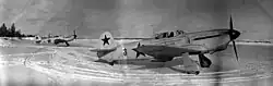 The Yak-1 was well liked by its pilots; Nikolai G. Golodnikov considered that the Yak-1B, flown by experienced pilots, could meet the Bf 109F-4 and G-2 on equal terms.[13][14] The French Normandie-Niemen squadron selected the primitive model Yak-1M (that had a cut-down fuselage to allow all-round vision) when it was formed, in March 1943.[15] Twenty-four of these aircraft were sent to the all-female 586th Fighter Aviation Regiment, whose pilots included the world's only female aces: Katya Budanova, with 5, and Lydia Litvyak (claims range between 5 and 12, plus two shared). Litvyak flew Yak-1 "Yellow 44", with an aerial mast, at first in 296th Fighter Aviation Regiment and then with 73rd Guards Fighter Aviation Regiment, until her death in combat on 1 August 1943.[16] Another ace who flew the Yak-1 was Mikhail Baranov, who scored all his 24 victories with it, including five in a day (four Bf 109s and a Ju 87, on 6 August 1942).[17] The Yak-1 was also the first type operated by the 1 Pułk Lotnictwa Myśliwskiego "Warszawa" (1st Polish Fighter Regiment "Warsaw").