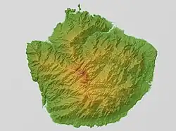 The bedrock of the island is granite, so there are no active volcanoes.[8] The island has an area of 504.5 square kilometres (194.8 sq mi) and is roughly circular, with a circumference of 89 kilometres (55 mi) and a diameter of 28 kilometres (17 mi). Its highest elevations are Miyanouradake (宮之浦岳), at 1,935 metres (6,348 ft), and Nagatadake (永田岳), at 1,886 metres (6,188 ft). Yakushima has another 30 peaks of over 1,000 metres (3,300 ft) in height. There are numerous hot springs on the island.