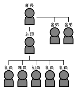 The structure of yakuza organizations is characterized by a multi-layered hierarchical structure. The kobun (pseudo child) of an organization become oyabun (family head and pseudo parent) and run their own subsidiary organizations, and the kobun of the subsidiary organizations also become oyabun and run their own subsidiary organizations. A large yakuza organization such as the Yamaguchi-gumi is made up of five or six layered organizations.[23][24][25] In other words, the heads of subsidiary organizations are often executives of the parent organizations.[26]
