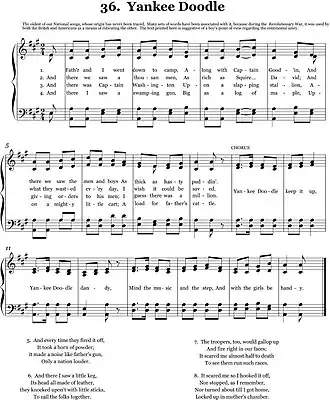 "Yankee Doodle" is a traditional song and nursery rhyme, the early versions of which predate the Seven Years' War and American Revolutionary War.[1] It is often sung patriotically in the United States today. It is the state song of the U.S. state of Connecticut.[2] Its Roud Folk Song Index number is 4501.