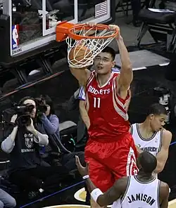 Yao, who was born in Shanghai, started playing for the Sharks as a teenager, and played on their senior team for five years in the CBA, winning a championship in his final year. After negotiating with the CBA and the Sharks to secure his release, Yao was selected by the Rockets as the first overall pick in the 2002 NBA draft. He reached the NBA playoffs four times, and the Rockets won the first-round series in the 2009 postseason, their first playoff series victory since 1997. In July 2011, Yao announced his retirement from professional basketball because of a series of foot and ankle injuries which forced him to miss 250 games in his last six seasons.[2] In eight seasons with the Rockets, Yao ranks sixth among franchise leaders in total points and total rebounds, and second in total blocks.[3]