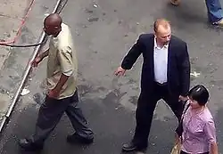 Yasiin Bey and Bruce Willis on the set of 16 Blocks, filmed on location in Chinatown, Manhattan