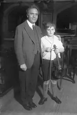 Menuhin's first violin instruction was at age four by Sigmund Anker (1891–1958); his parents had wanted Louis Persinger to teach him, and Persinger agreed. Menuhin took lessons for a while from Persinger at his Hyde Street studio. He made his first public solo appearance in November 1921, at a pupil's concert.[3] On 29 February 1924, he formally debuted in a solo performance for a matinee concert given by the San Francisco Symphony at the Oakland Auditorium under the direction of Alfred Hertz, with Persinger playing the piano accompaniment.[4] This was followed by a recital at the Scottish Rite Hall. His reputation preceded him to New York for his debut there on 17 March 1926, at the Manhattan Opera House.[5] Persinger then agreed to teach him and accompanied him on the piano for his first few solo recordings in 1928 and 1929.