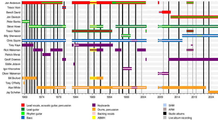Yes are an English progressive rock band formed in London in 1968. Comprising 20 full-time musicians over their career, their most notable members include lead singer Jon Anderson, bassist Chris Squire, guitarists Steve Howe and Trevor Rabin, drummers Bill Bruford and Alan White, and keyboardists Tony Kaye and Rick Wakeman. The band have explored several musical styles and are often regarded as progressive rock pioneers. Since February 2023, the band's line-up consists of Howe, keyboardist Geoff Downes, bassist Billy Sherwood, singer Jon Davison, and drummer Jay Schellen.