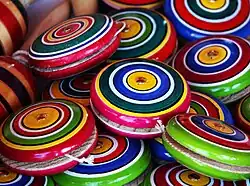 Yo-yos were known to the Ancient Greeks, and they appear in several Ancient Greek vase paintings, though the Ancient Greek word for them is unknown.[1] Surviving examples from the period exist made of bronze and terra cotta (fired clay), though the most common material was likely wood.[1]