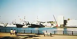From the 1950s, United States Fleet Activities Yokosuka has been home port for the United States Seventh Fleet, and played a critical support role in the Korean War and the Vietnam War.[4] Yokosuka was the site of many anti-war protests during the late 1960s and 1970s. The nuclear-powered USS George Washington, formerly based at Yokosuka, was the first U.S. nuclear-powered ship that had been permanently based in Japan. The Japan Maritime Self-Defense Force also operates a military port next to the American base, as well as numerous training facilities at scattered locations around the city. For those reasons, there are a few hundred Americans and a thousand Filipinos in Yokosuka.[5]