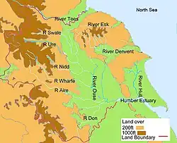Historically, the northern boundary of Yorkshire was the River Tees, the eastern boundary was the North Sea coast and the southern boundary was the Humber Estuary and Rivers Don and Sheaf. The western boundary meandered along the western slopes of the Pennine Hills to again meet the River Tees.[55]