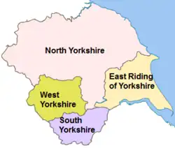 | • Ceremonial counties (most of) | North Yorkshire • East Riding of Yorkshire • South Yorkshire • West Yorkshire |