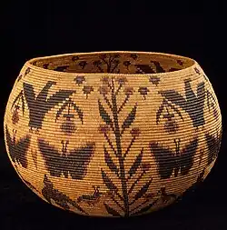 After the Mariposa War, Native Americans continued to live in the Yosemite area in reduced numbers. The remaining Yosemite Ahwahneechee tribe members there were forced to relocate to a village constructed in 1851 by the state government.[11] They learned to live within this camp and their limited rights, adapting to the changed environment by entering the tourism industry through employment and small businesses, manufacturing and selling goods, and providing services.[22] In 1953, the National Park Service banned all non-employee Natives from residing in the Park and evicted the non-employees who had residence. In 1969, with only a few families left in the Park, the National Park Service evicted the remaining Native people living within the Park (all Park employees and their families) to a government housing area for park employees and destroyed the village as part of a fire-fighting exercise.[32][26] A reconstructed "Indian Village of Ahwahnee" sits behind the Yosemite Museum, located next to the Yosemite Valley Visitor Center.[33][34][35]