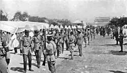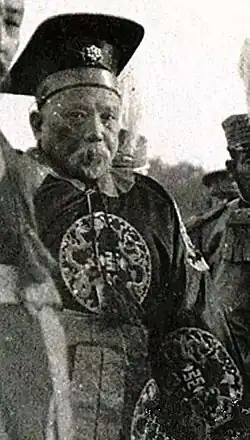 Having gained powerful allies that included Empress Dowager Cixi, and being appointed as the Viceroy of Zhili and Beiyang Trade Minister, Yuan was in a position that allowed him to expand his army and increase its funding.[60] It was at this time that Yuan established the Beiyang Army,[61] with the creation of the Left Division of the Beiyang Standing Army in October 1902.[62] In December 1902 he was also ordered to train several thousand Manchu Bannermen, and these later became the 1st Division of the Beiyang Army, while the Left Division was renamed the 2nd Division.[62] It was meant to become the core of a Chinese regular army,[61] and although Yuan had a lot of influence over it, the central government had administrative control and provided the army's funding.[63] In 1904 Yuan used the Russo-Japanese War to convince Cixi to authorize the creation of more divisions. Because of this the Beiyang Army reached a strength of 60,000 men.[63] In mid-1902 he established a military staff to assist him in his role as Beiyang Army commander, and its two most prominent members were Feng Guozhang and Duan Qirui.[64] The "Beiyang clique" became the origin of the majority of warlords in northern China during the warlord period in the 1910s and 1920s.[61] As one historian wrote, "the [Beiyang] Army was the most significant military development in China between the [Xiang] and Huai Armies which suppressed the Taiping and [Nian] rebellions in the 1860's and the army that Chiang Kai-shek raised and employed in the northern expedition of 1926-27."[65]