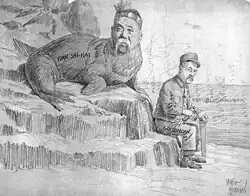China's reassertion of suzerainty over Korea aggravated the split between pro-Japanese Korean progressives and pro-Chinese conservatives. In December 1884 the progressives attempted to form a new government with Japanese backing during the Gapsin Coup, and the conservatives led by Queen Min turned to the Chinese garrison for help. Yuan led his troops to defeat the outnumbered Japanese and recover King Gojong. The 26-year-old Yuan established himself as a resourceful leader, and from that point Viceroy Li Hongzhang gave him a critical role in regaining Chinese control of Korea.[16] In October 1885, Yuan was appointed Chinese imperial resident in Korea by Li,[16][17] restoring a custom that dated back to the Mongol Yuan dynasty.[18] Yuan Shikai spent the next nine years in that position[16] and operated as if he were above the law.[18] He ended any attempts at reform, changed the composition of the Korean government, and worked to minimize any other foreign influence, especially Japanese. Yuan was allied to the corrupt Min oligarchy, and historians have characterized his reign in Korea as a "dark age".[18] His behavior and rule created a lot of antagonism against him and China among Koreans.[16][19] However, during those years China was able to maintain its control over Korea and contain Japanese and Russian influence.[16][18][20] He wanted to remove Gojong from the throne on several occasions, but was prevented from doing so by Li Hongzhang.[21][22]