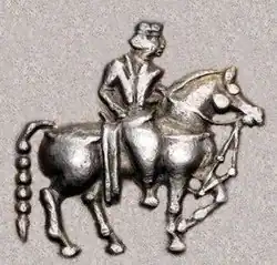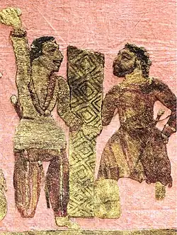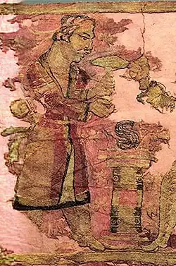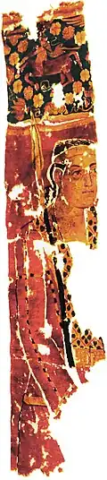 Figures in one of the embroidered carpets of the Xiongnu Noin-Ula burial site, a luxury item probably imported from Bactria.[7] They are thought to represent Yuezhis. 1st century BC - 1st century AD.[1][3][4][5][6][37]