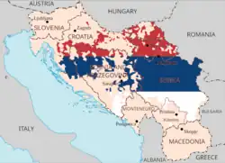 The distribution of ethnic Serbs in Croatia, Bosnia, and Serbia in 1981 (delineated with the Serbian tricolor)