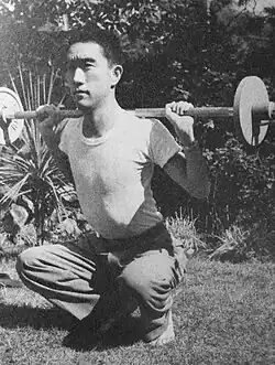 In 1955, Mishima took up weight training to overcome his weak constitution, and his strictly observed workout regimen of three sessions per week was not disrupted for the final 15 years of his life. In his 1968 essay Sun and Steel,[156] Mishima deplored the emphasis given by intellectuals to the mind over the body. He later became very skilled (5th Dan) at kendo (traditional Japanese swordsmanship), and became 2nd Dan in battōjutsu, and 1st Dan in karate. In 1956, he tried boxing for a short period of time. In the same year, he developed an interest in UFOs and became a member of the "Japan Flying Saucer Research Association" (日本空飛ぶ円盤研究会, Nihon soratobu enban kenkyukai).[157]