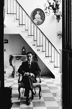 In 1965, Mishima wrote the play Madame de Sade that explores the complex figure of the Marquis de Sade, traditionally upheld as an exemplar of vice, through a series of debates between six female characters, including the Marquis' wife, the Madame de Sade. At the end of the play, Mishima offers his own interpretation of what he considered to be one of the central mysteries of the de Sade story—the Madame de Sade's unstinting support for her husband while he was in prison and her sudden decision to renounce him upon his release.[141][142] Mishima's play was inspired in part by his friend Tatsuhiko Shibusawa's 1960 Japanese translation of the Marquis de Sade's novel Juliette and a 1964 biography Shibusawa wrote of de Sade.[143] Shibusawa's sexually explicit translation became the focus of a sensational obscenity trial remembered in Japan as the "Juliette Case" (サド裁判, Sado saiban), which was ongoing as Mishima wrote the play.[141] In 1994, Madame de Sade was evaluated as the "greatest drama in the history of postwar theater" by Japanese theater criticism magazine Theater Arts (シアター・アーツ).[144][145]