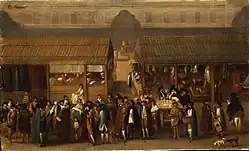 Over much of the 17th century, the plaza became overrun with makeshift market stalls. After a mob burned the Viceregal Palace in 1692, depicted in the famous 1696 painting by Cristóbal de Villalpando, authorities attempted to completely clear the plaza to make way for more permanent market facilities, the Parián de Manila (or simply Parián or the Alcaicería), named after the silk trading district of Manila in Spanish Philippines.[9][10][11]