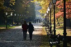 The oldest settlement in the vicinity of the city was the Roman Andautonia, in today's Šćitarjevo.[12] The historical record of the name "Zagreb" dates from 1134, in reference to the foundation of the settlement at Kaptol in 1094. Zagreb became a free royal city in 1242.[13] In 1851, Janko Kamauf became Zagreb's first mayor.[14] Zagreb has special status as a Croatian administrative division—it comprises a consolidated city-county (but separate from Zagreb County),[15] and is administratively subdivided into 17 city districts.[16] Most of the city districts lie at a low elevation along the valley of the river Sava, whereas northern and northeastern city districts, such as Podsljeme[17] and Sesvete[18] districts are spread out across the foothills of the Medvednica mountain,[19] making the city's geographical image rather diverse. The city spans about 30 km from east to west, while stretching about 20 km from north to south.[20][21] Zagreb ranks as a global city, with a 'Beta-' rating from the Globalization and World Cities Research Network.[22]