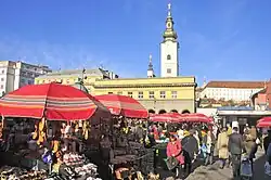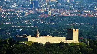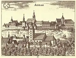 The name is probably derived from Proto-Slavic word *grębъ which means "hill" or "uplift". An Old Croatian reconstructed name Zagrębъ is manifested through the city's former German name, Agram.[31] Some linguists (e.g. Nada Klaić, Miroslav Kravar) propose a metathesis of *Zabreg, which would originate from Old Slavic breg (see Proto-Slavic *bergъ) in the sense of "riverbank", referring to River Sava. This metathesis has been attested in Kajkavian,[32] but the meaning of "riverbank" is lost in modern Croatian and folk etymology associates it instead with breg "hill", ostensibly referring to Medvednica. Hungarian linguist Gyula Décsy similarly uses metathesis to construct *Chaprakov(o), a putative Slavicisation of a Hungarian hypocorism for "Cyprian", similar to the etymology of Csepreg, Hungary.[33] The most likely derivation is *Zagrębъ in the sense of "embankment" or "rampart", i.e. remains of the 1st millennium fortifications on Grič.[32][31]