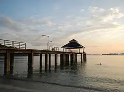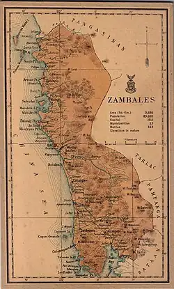 The Spanish first explored the area in 1572, led by Juan de Salcedo.[6] Off Cape Bolinao (now part of Pangasinan), he and his men liberated a Zambal chieftain and his followers from a Chinese pirate ship. This act gained the natives' goodwill. Shortly thereafter, the province was organized. Among the earliest towns founded were Masinloc (1607), Subic (1607), Iba (1611), Santa Cruz (1612), and Botolan (1736).[7] Zambales was originally derived from 2 parts: the southern area from Pampanga and the northern area from Pangasinan.