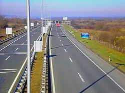 The town is a major transport hub for the area of Zagreb County and Zagreb itself. It is thus known as the "northwestern gate to Zagreb County."[18] The Zagreb bypass, and the tolled A2 highway (Zagreb–Macelj, toward Austria; part of European Route E59, and pan-European corridor Xa) pass through the eastern part of Zaprešić, providing Zaprešić with highway access at a cloverleaf interchange. The D225 state road is a major arterial road in Zaprešić. It forms the Pavao Lončar and Marshal Tito Streets, leading west towards Brdovec, Marija Gorica and Slovenia, and east towards western Zagreb, Jablanovec, and Stubica.[18][58] According to the current urban plan, the traffic on the D225 will be re-routed through two bypasses along the northern and western railway lines to clear the center of Zaprešić of 25,000 daily commuters driving on a two-lane road.[59][note 4]